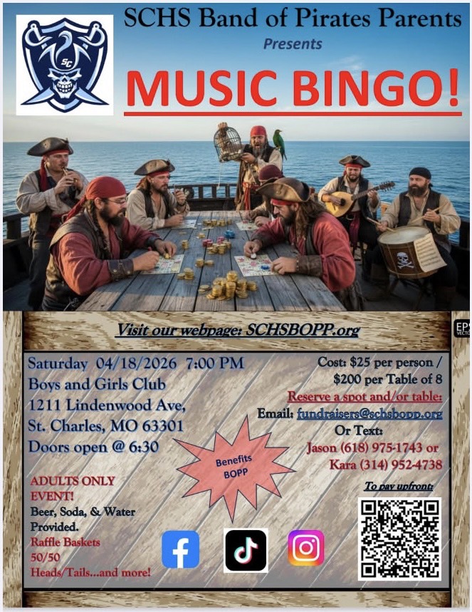 This event directly supports the St. Charles High School Band of Pirates Parents (BOPP).